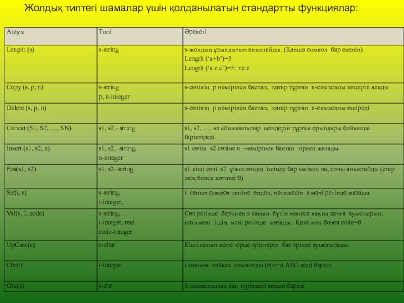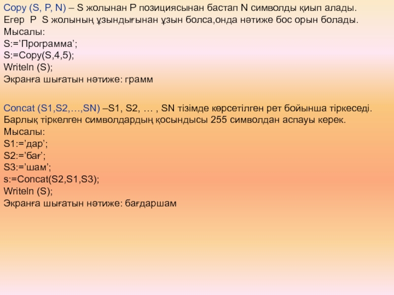 Concat (S1,S2,…,SN) –S1, S2, … , SN тізімде көрсетілген рет бойынша тіркеседі. Барлық тіркелген символдардың қосындысы 255 символдан аспауы керек.