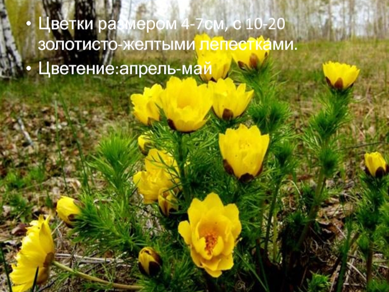 Слайд 4Цветки размером 4-7см, с 10-20 золотисто-желтыми лепестками.