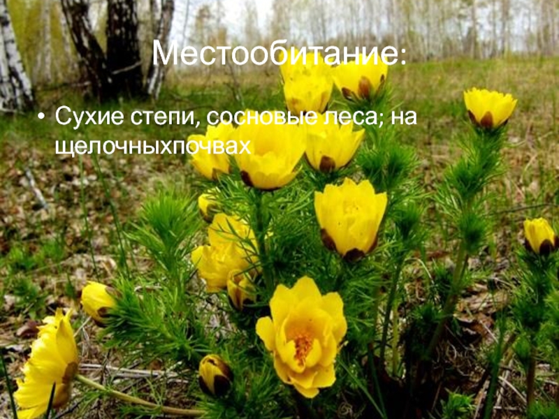 Сухие степи, сосновые леса; на щелочныхпочвах