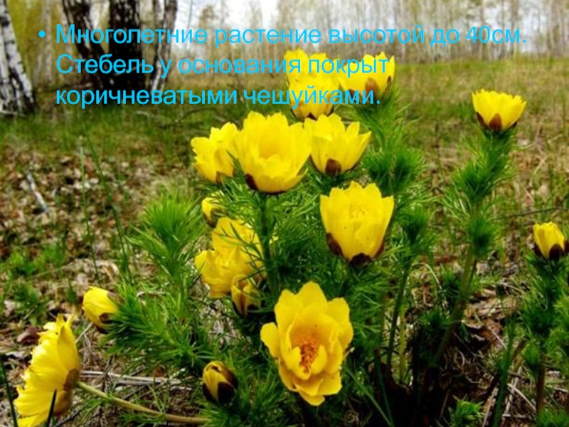 Слайд 2Многолетние растение высотой до 40см. Стебель у основания покрыт коричневатыми