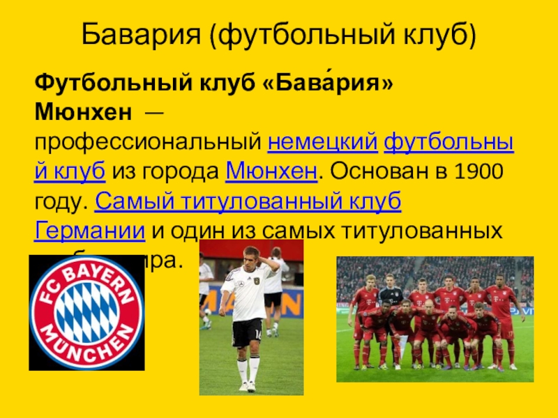 Футбольный клуб «Бава́рия» Мюнхен — профессиональный немецкий футбольный клуб из города Мюнхен. Основан