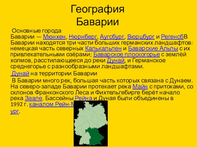 Основные города Баварии — Мюнхен, Нюрнберг, Аугсбург, Вюрцбург и РегенсбВ Баварии находятся три части больших германских