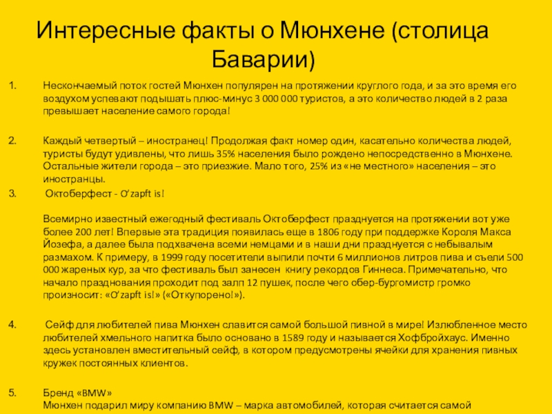 Слайд 6Интересные факты о Мюнхене (столица Баварии)