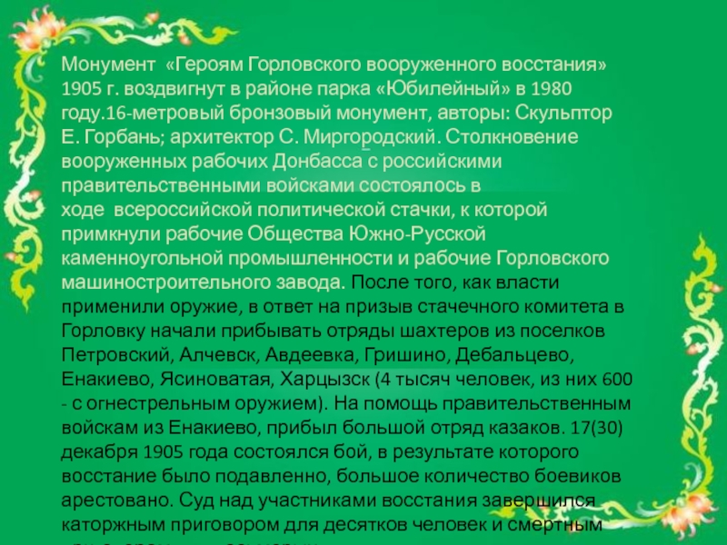 Горбань; архитектор С. Миргородский. Столкновение вооруженных рабочих Донбасса с российскими правительственными войсками состоялось в ходе всероссийской политической стачки, к которой примкнули рабочие Общества Южно-Русской каменноугольной промышленности и рабочие Горловского машиностроительного завода. После того, как власти применили оружие, в ответ на призыв стачечного комитета в Горловку начали прибывать отряды шахтеров из поселков Петровский, Алчевск, Авдеевка, Гришино, Дебальцево, Енакиево, Ясиноватая, Харцызск (4 тысяч человек, из них 600 - с огнестрельным оружием). На помощь правительственным войскам из Енакиево, прибыл большой отряд казаков. 17(30) декабря 1905 года состоялся бой, в результате которого восстание было подавленно, большое количество боевиков арестовано. Суд над участниками восстания завершился каторжным приговором для десятков человек и смертным приговором для восьмерых.