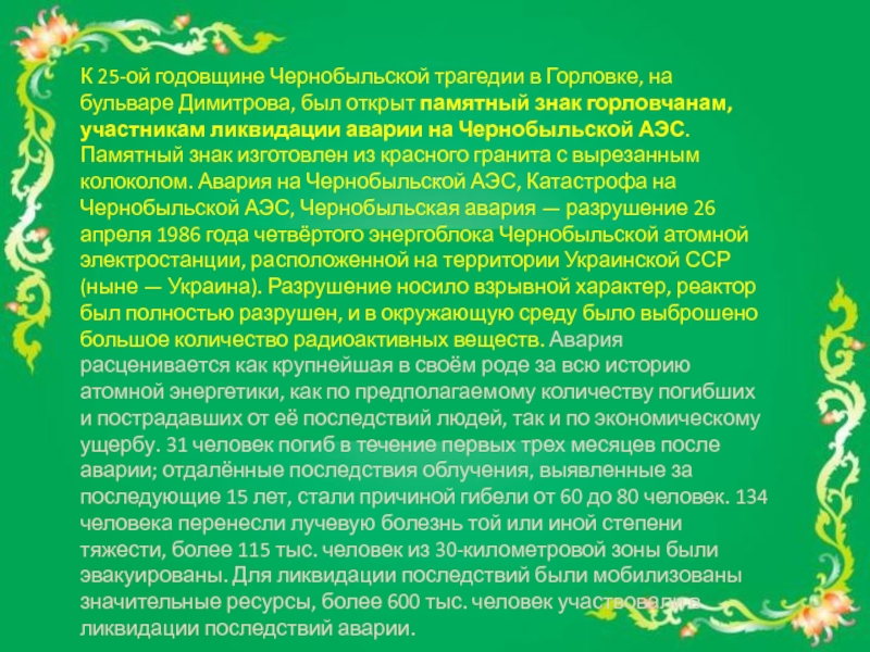 Слайд 7К 25-ой годовщине Чернобыльской трагедии в Горловке, на бульваре Димитрова,