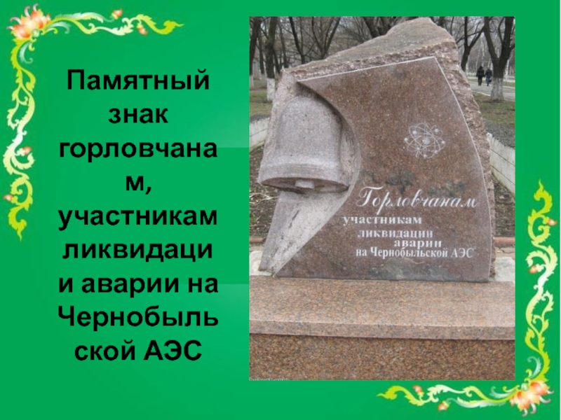 Слайд 6Памятный знак горловчанам, участникам ликвидации аварии на Чернобыльской АЭС