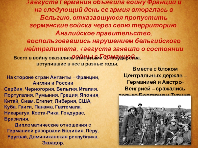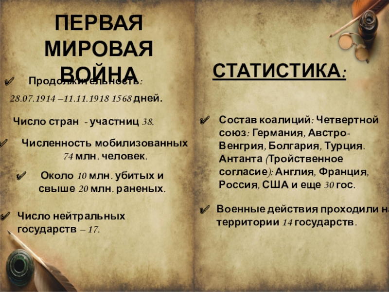 Состав коалиций: Четвертной союз: Германия, Австро-Венгрия, Болгария, Турция. Антанта (Тройственное согласие): Англия, Франция, Россия, США и еще 30 гос.