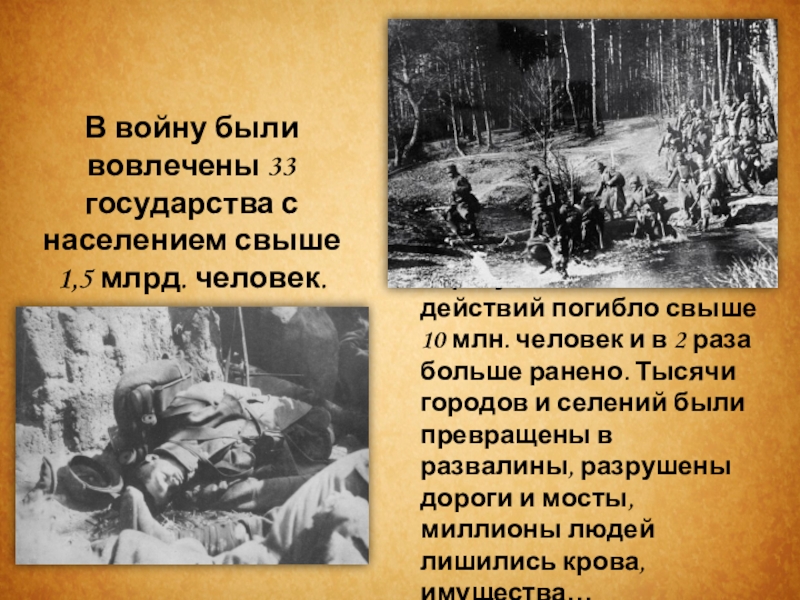 Всего в войну оказались втянутыми 33 государства, вступившие в нее в разные годы.