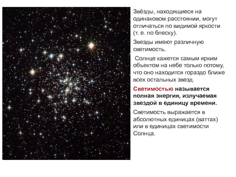 самым ярким объектом на небе только потому, что оно находится гораздо ближе всех остальных звезд. Светимостью называется полная энергия, излучаемая звездой в единицу времени.