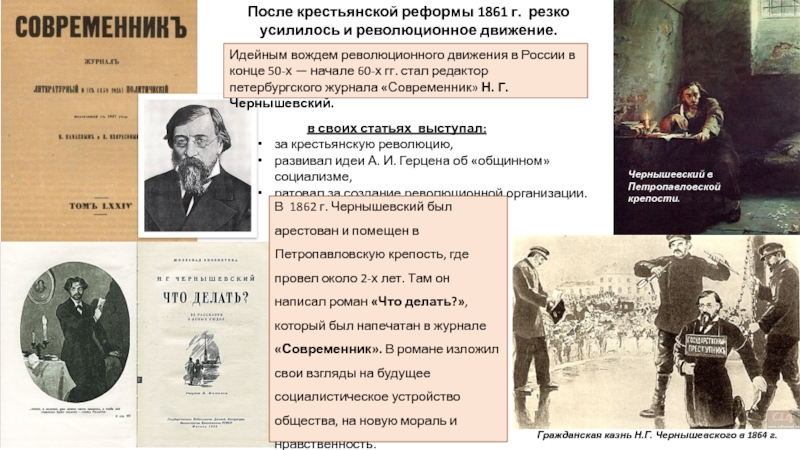 Он выступил против реформы 1861 г., считал её грабительской и половинчатой, направленной на приспособление крепостничества к новым экономическим условиям, связанным с развитием товарно-денежных отношений.