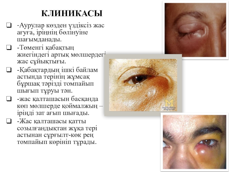 Клиникасы:ісіну, ауырсыну,қызару,көз формасының өзгеруі,көз алмасының қозғалғыштығының шектелуі,регионалды лимфа түйіндерінің ұлғайуы.