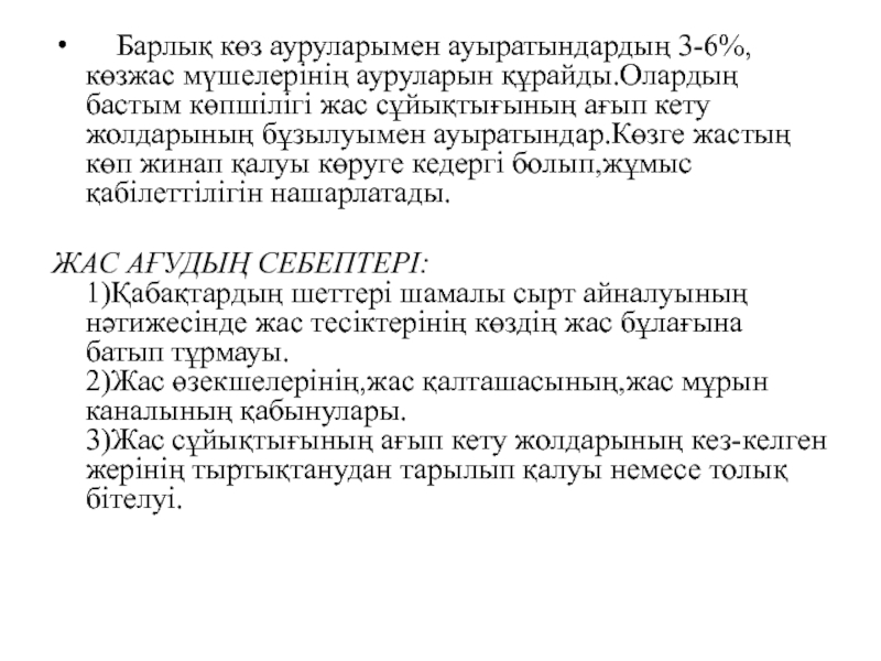 Слайд 10 Барлық көз ауруларымен ауыратындардың 3-6%,көзжас мүшелерінің ауруларын құрайды.Олардың