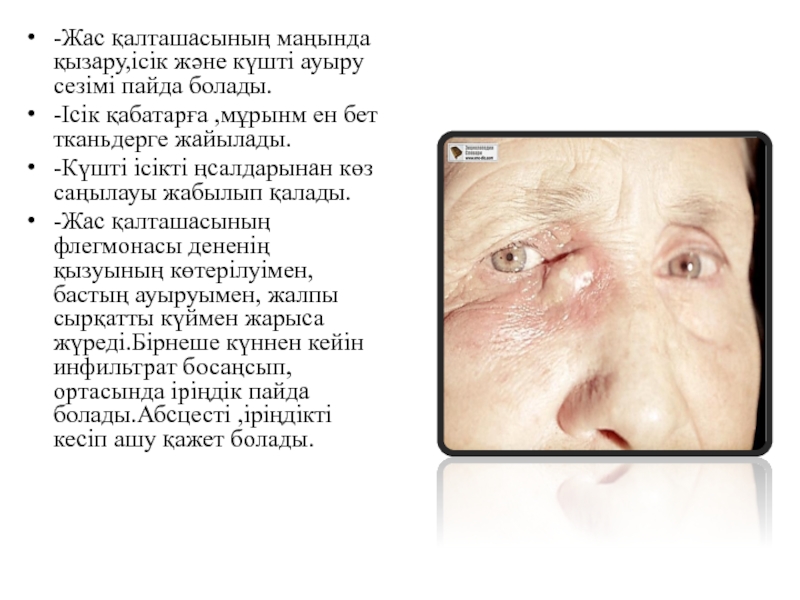 Слайд 24-Жас қалташасының маңында қызару,ісік және күшті ауыру сезімі пайда болады.