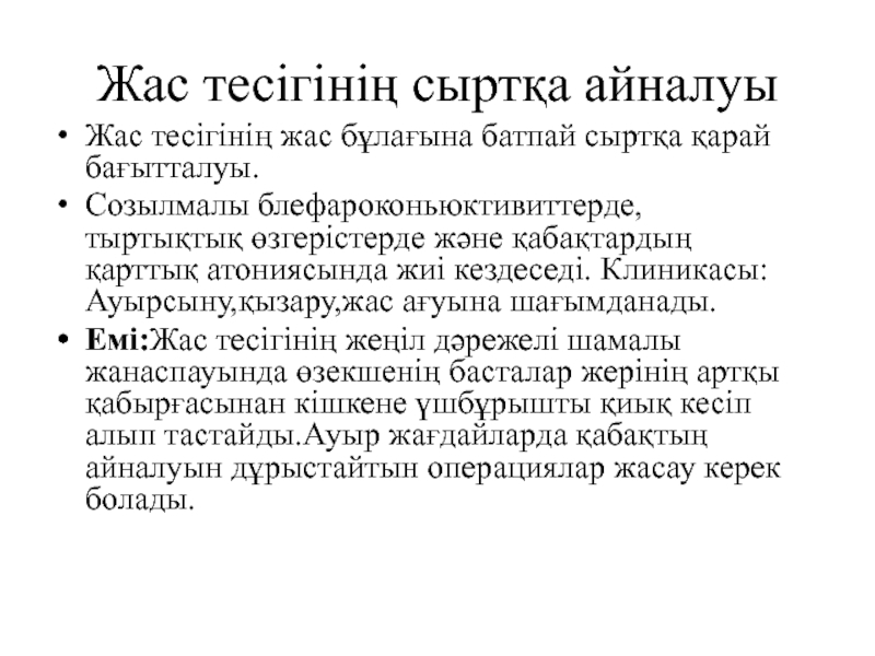 1)Қабақтардың шеттері шамалы сырт айналуының нәтижесінде жас тесіктерінің көздің жас бұлағына батып тұрмауы.