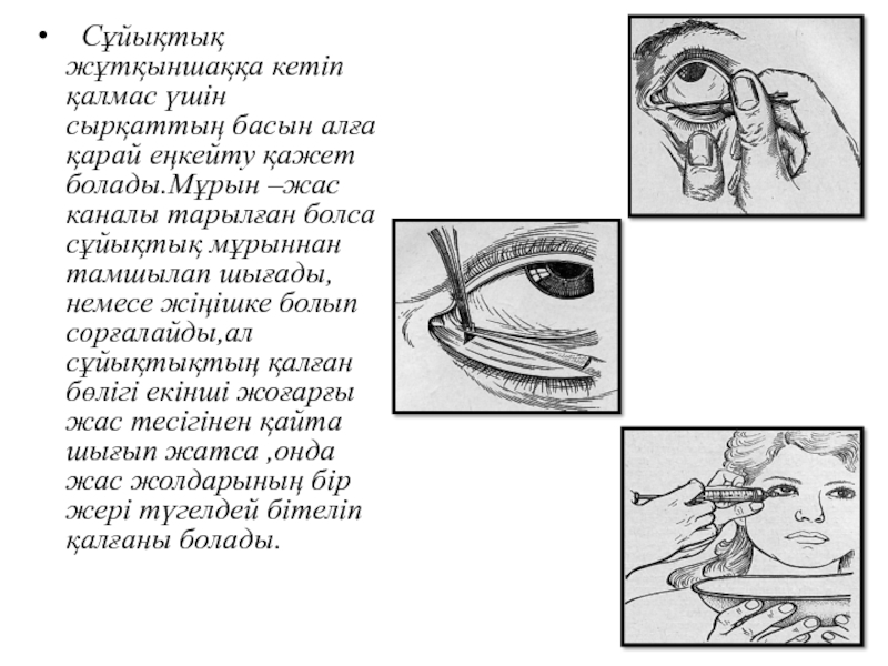 еңкейту қажет болады.Мұрын –жас каналы тарылған болса сұйықтық мұрыннан тамшылап