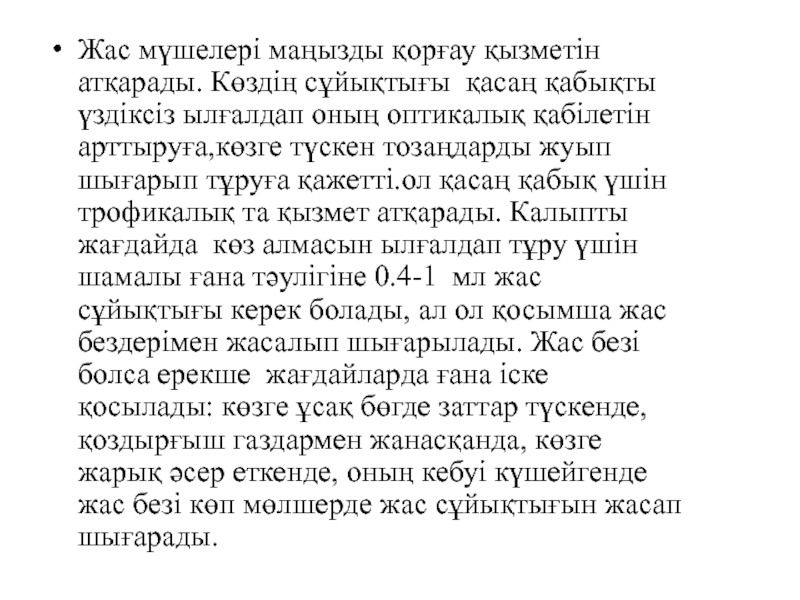 Слайд 7Жас мүшелері маңызды қорғау қызметін атқарады. Көздің сұйықтығы қасаң қабықты