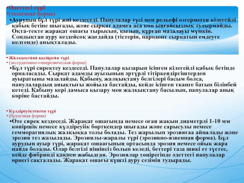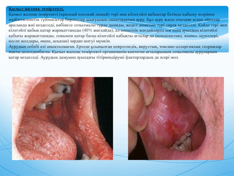 Дерматоздардың ауыз қуысындағы көрінісі. Қызыл жалпақ теміреткі (КПЛ), жүйелі қызыл волчанка. Пузырчатка. Этиологиясы, патогенезі, клиникасы, диагностикасы, дифференциалды диагностикасы, емі.