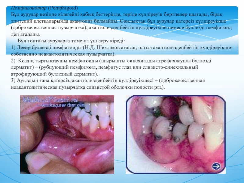 3) Ауыздың ғана қатерсiз, акантолизденбейтiн күлдiреуiкшесi – (доброкачественная неакантолитическая пузырчатка слизистой оболочки полости рта).