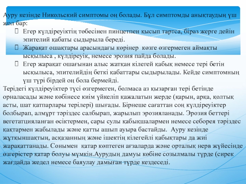 Слайд 20Ауру кезiнде Никольский симптомы оң болады. Бұл симптомды анықтаудың үш