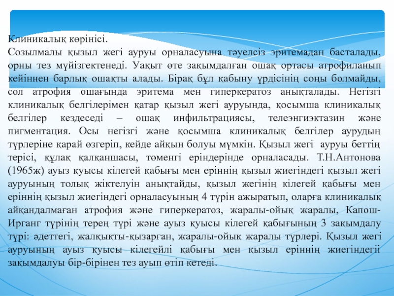 ошақты алады. Бiрақ бұл қабыну үрдiсiнiң соңы болмайды, сол атрофия ошағында эритема мен гиперкератоз анықталады. Негiзгi клиникалық белгiлерiмен қатар қызыл жегi ауруында, қосымша клиникалық белгiлер кездеседi – ошақ инфильтрациясы, телеэнгиэктазин және пигментация. Осы негiзгi және қосымша клиникалық белгiлер аурудың түрлерiне қарай өзгерiп, кейде айқын болуы мүмкiн. Қызыл жегi ауруы беттiң терiсi, құлақ қалқаншасы, төменгi ерiндерiнде орналасады. Т.Н.Антонова (1965ж) ауыз қуысы кiлегей қабығы мен ерiннiң қызыл жиегiндегi қызыл жегi ауруының толық жiктелуiн анықтайды, қызыл жегiнiң кiлегей қабығы мен ерiннiң қызыл жиегiндегi орналасуының 4 түрiн ажыратып, оларға клиникалық айқандалмаған атрофия және гиперкератоз, жаралы-ойық жаралы, Капош-Ирганг түрiнiң терең түрi және ауыз қуысы кiлегей қабығының 3 зақымдалу түрi: әдеттегi, жалқықты-қызарған, жаралы-ойық жаралы түрлерi. Қызыл жегi ауруының ауыз қуысы кiлегейлi қабығы мен қызыл ерiннiң жиегiндегii зақымдалуы бiр-бiрiнен тез ауып өтiп кетедi.
