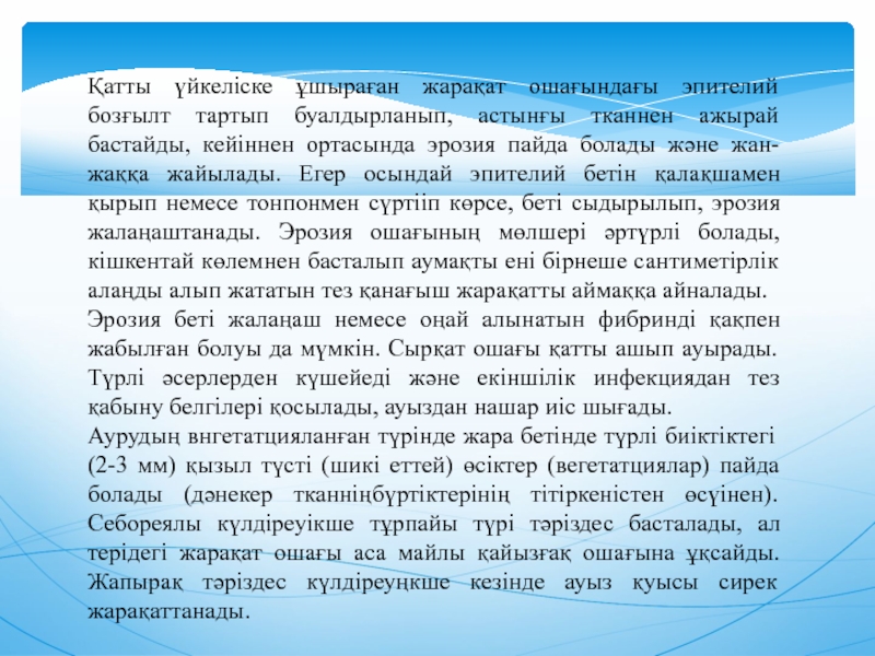 жайылады. Егер осындай эпителий бетiн қалақшамен қырып немесе тонпонмен сүртiiп көрсе, бетi сыдырылып, эрозия жалаңаштанады. Эрозия ошағының мөлшерi әртүрлi болады, кiшкентай көлемнен басталып аумақты енi бiрнеше сантиметiрлiк алаңды алып жататын тез қанағыш жарақатты аймаққа айналады.
