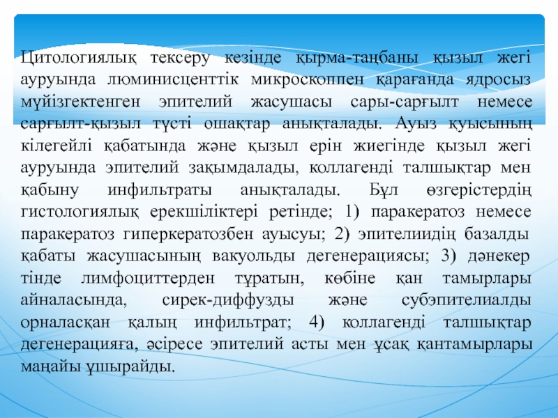 Слайд 11Цитологиялық тексеру кезiнде қырма-таңбаны қызыл жегi ауруында люминисценттiк микроскоппен қарағанда
