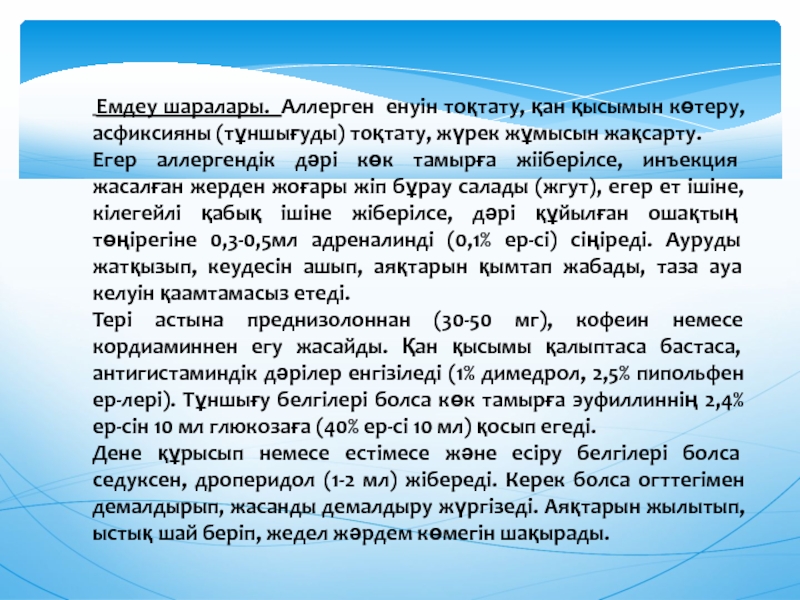 Слайд 9 Емдеу шаралары. Аллерген енуiн тоқтату, қан қысымын көтеру, асфиксияны