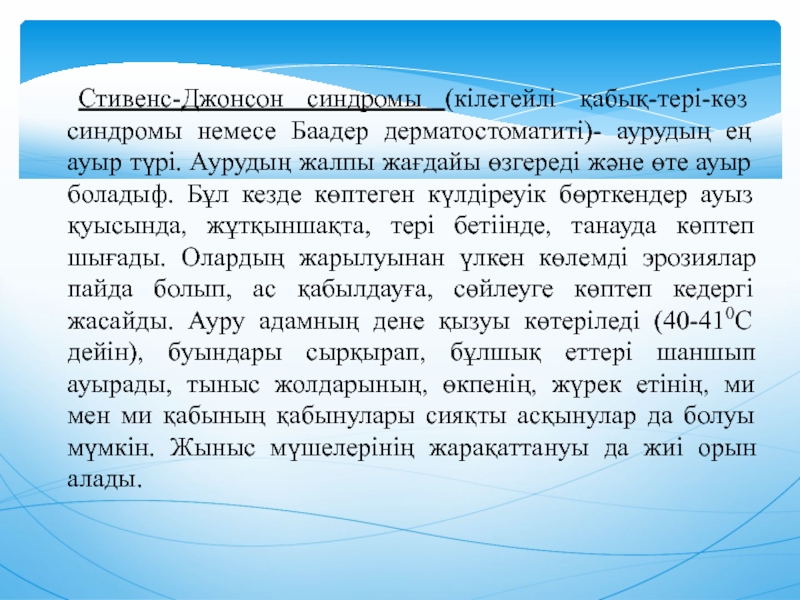 Слайд 26 Стивенс-Джонсон синдромы (кiлегейлi қабық-терi-көз синдромы немесе Баадер дерматостоматитi)- аурудың