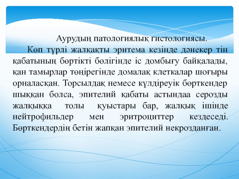 түрлi жалқақты эритема кезiнде дәнекер тiн қабатының бөртiктi бөлiгiнде iс домбығу байқалады, қан тамырлар төңiрегiнде домалақ клеткалар шоғыры орналасқан. Торсылдақ немесе күлдiреуiк бөрткендер шыққан болса, эпителий қабаты астындаа серозды жалқыққа толы қуыстары бар, жалқық iшiнде нейтрофильдер мен эритроциттер кездеседi. Бөрткендердiң бетiн жапқан эпителий некрозданған.