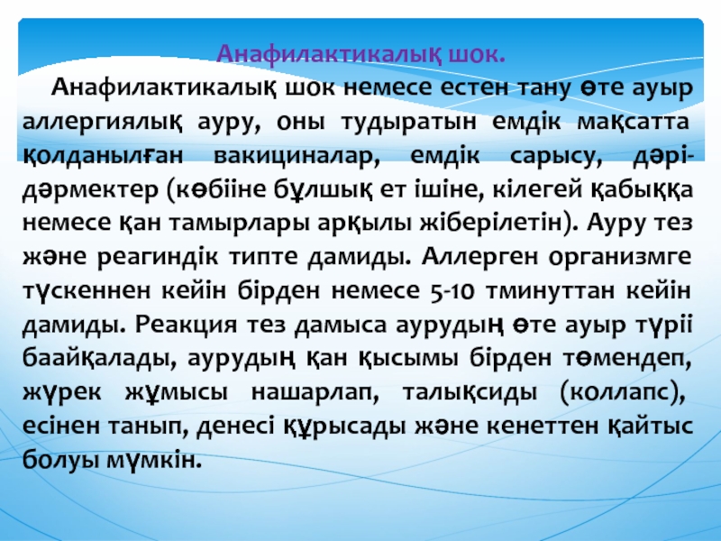 Анафилактикалық шок немесе естен тану өте ауыр аллергиялық ауру, оны тудыратын емдiк мақсатта қолданылған вакициналар, емдiк сарысу, дәрi-дәрмектер (көбiiне бұлшық ет iшiне, кiлегей қабыққа немесе қан тамырлары арқылы жiберiлетiн). Ауру тез және реагиндiк типте дамиды. Аллерген организмге түскеннен кейiн бiрден немесе 5-10 тминуттан кейiн дамиды. Реакция тез дамыса аурудың өте ауыр түрii баайқалады, аурудың қан қысымы бiрден төмендеп, жүрек жұмысы нашарлап, талықсиды (коллапс), есiнен танып, денесi құрысады және кенеттен қайтыс болуы мүмкiн.