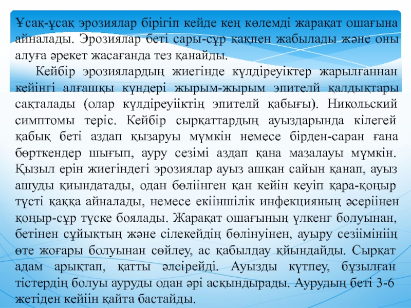 Слайд 23Ұсақ-ұсақ эрозиялар бiрiгiп кейде кең көлемдi жарақат ошағына айналады. Эрозиялар