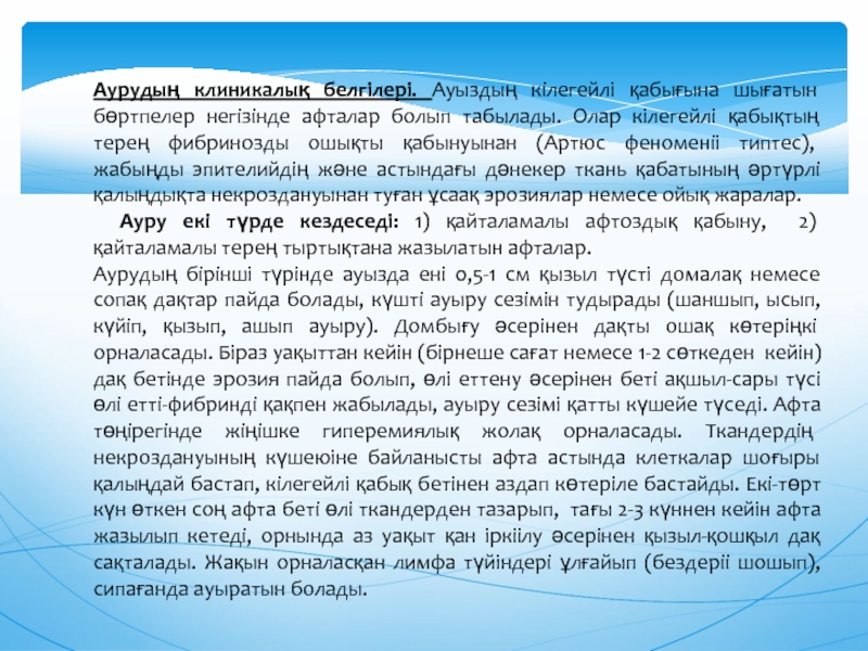 Слайд 14Аурудың клиникалық белгiлерi. Ауыздың кiлегейлi қабығына шығатын бөртпелер негiзiнде афталар