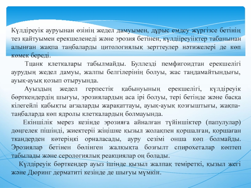 Слайд 28Күлдiреуiк ауруынан өзiнiң жедел дамуымен, дұрыс емдеу жүргiзсе бетiнiң тез