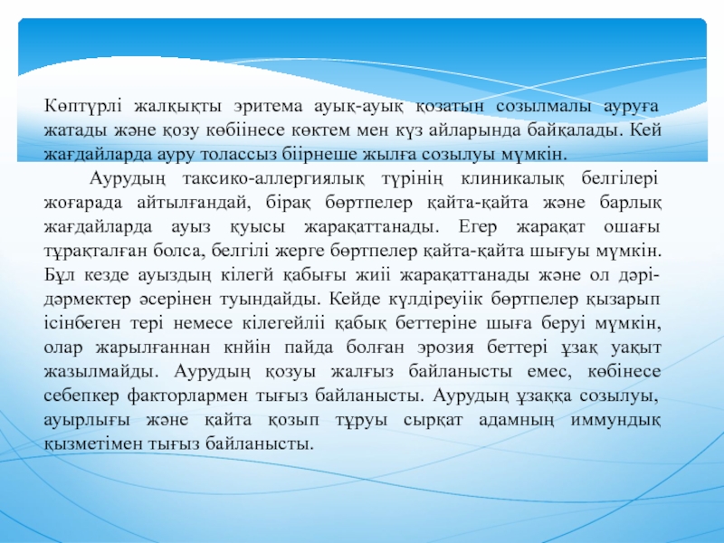 Слайд 24Көптүрлi жалқықты эритема ауық-ауық қозатын созылмалы ауруға жатады және қозу
