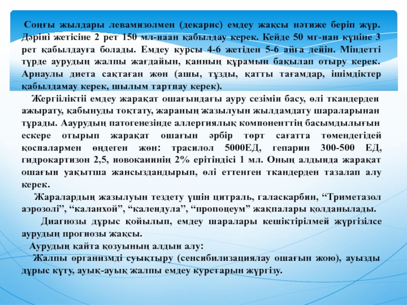 Слайд 18 Соңғы жылдары левамизолмен (декарис) емдеу жақсы нәтиже берiп жүр.