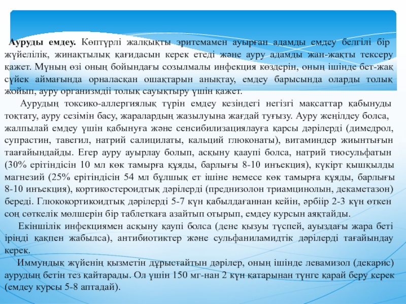 Слайд 29 Ауруды емдеу. Көптүрлi жалқықты эритемамен ауырған адамды емдеу белгiлi