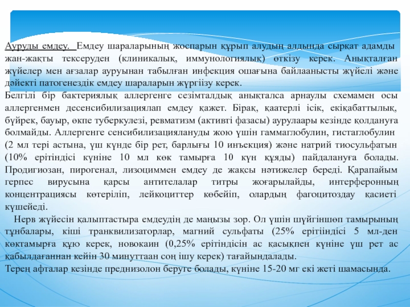 Белгiлi бiр бактериялық аллергенге сезiмталдық анықталса арнаулы схемамен осы аллергенмен десенсибилизациялап емдеу қажет. Бiрақ, қаатерлi iсiк, екiқабаттылық, бүйрек, бауыр, өкпе туберкулезi, ревматизм (активтi фазасы) аурулаары кезiнде қолдануға болмайды. Аллергенге сенсибилизациялануды жою үшiн гаммаглобулин, гистаглобулин (2 мл терi астына, үш күнде бiр рет, барлығы 10 инъекция) және натрий тиосульфатын (10% ерiтiндiсi күнiне 10 мл көк тамырға 10 күн құяды) пайдалануға болады. Продигиозан, пирогенал, лизоциммен емдеу де жақсы нәтижелер бередi. Қарапайым герпес вирусына қарсы антителалар титры жоғарылайды, интерферонның концентрациясы көтерiлiп, лейкоциттер көбейiп, олардың фагоцитоздау қасиетi күшейедi.