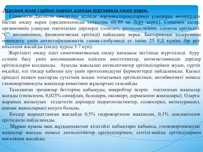Стивенсон-Джонсон синдромы кезiнде кортикостероидтармен үлкенiрек мөлшерден бастап емдеу керек