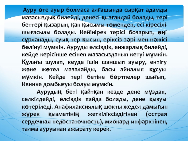 Слайд 8 Ауру өте ауыр болмаса алғашында сырқат адамды мазасыздық билейдi,