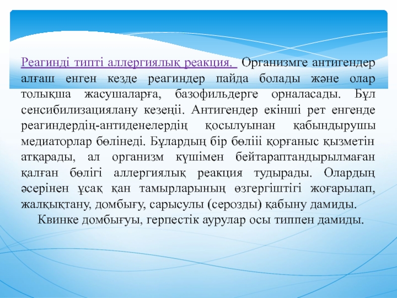 Слайд 4Реагиндi типтi аллергиялық реакция. Организмге антигендер алғаш енген кезде реагиндер