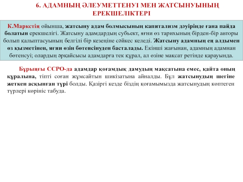 болатын ерекшелігі. Жатсыну адамдардың субъект, яғни өз тарихының бірден-бір авторы
