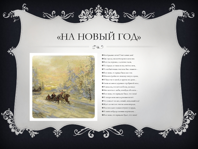 «На новый год»Безотрадные ночи! Счастливые дни! Как стрела, как мечта пронеслися они. Я не год пережил, а