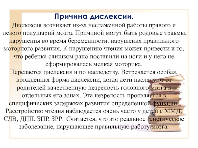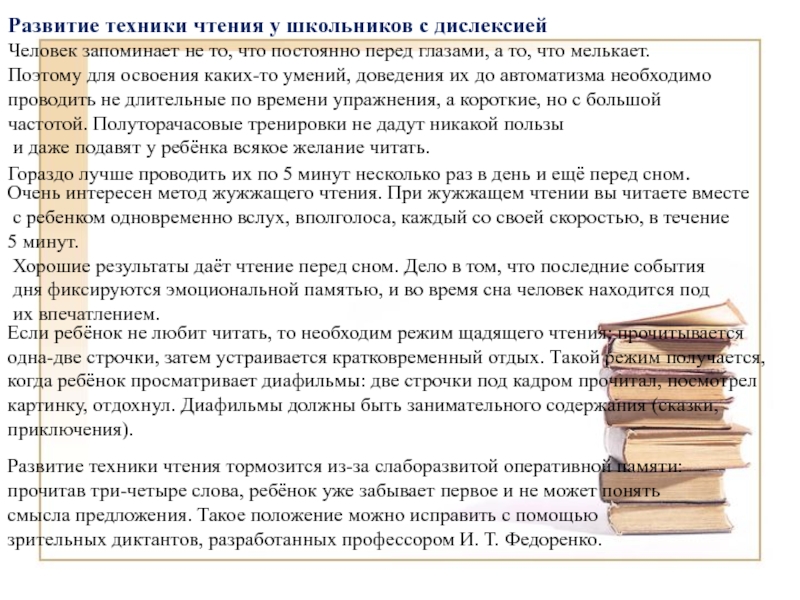Развитие техники чтения тормозится из-за слаборазвитой оперативной памяти: прочитав три-четыре слова, ребёнок уже забывает первое и не может понять смысла предложения. Такое положение можно исправить с помощью зрительных диктантов, разработанных профессором И. Т. Федоренко.
