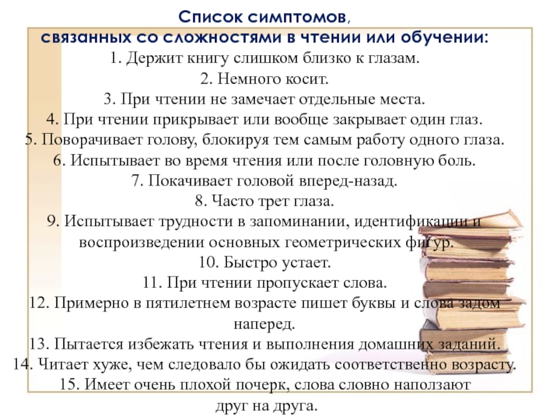 Если ребёнок не любит читать, то необходим режим щадящего чтения: прочитывается одна-две строчки, затем устраивается кратковременный отдых. Такой режим получается, когда ребёнок просматривает диафильмы: две строчки под кадром прочитал, посмотрел картинку, отдохнул. Диафильмы должны быть занимательного содержания (сказки, приключения).
