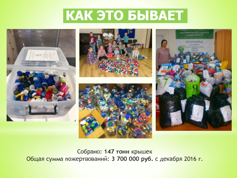 на переработку на завод группы компаний «ЭкоТехнологии», в город Тверь (а также на другие заводы-партнеры проекта)Завод взвешивает сырье и переводит деньги за крышечки в благотворительный фонд «Волонтеры в помощь детям-сиротам». Все вырученные средства за вторсырье направляются на покупку инвалидных кресел/колясок и другой реабилитационной техники для нуждающихся детей