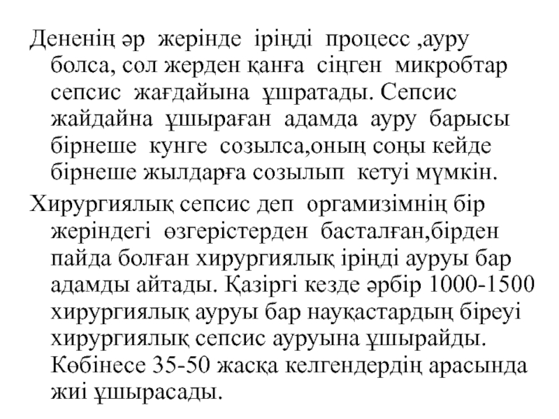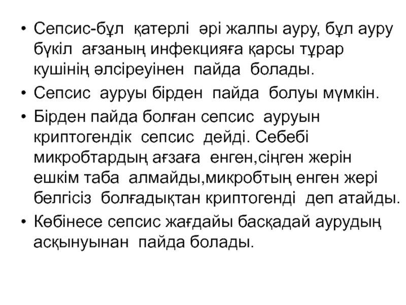 Слайд 9Сепсис-бұл қатерлі әрі жалпы ауру, бұл ауру бүкіл ағзаның инфекцияға