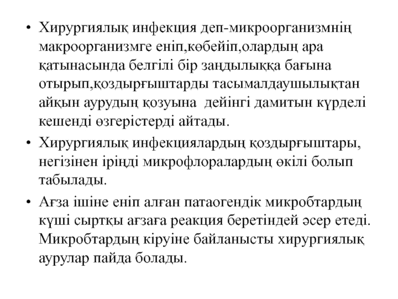 Слайд 3Хирургиялық инфекция деп-микроорганизмнің макроорганизмге еніп,көбейіп,олардың ара қатынасында белгілі бір заңдылыққа