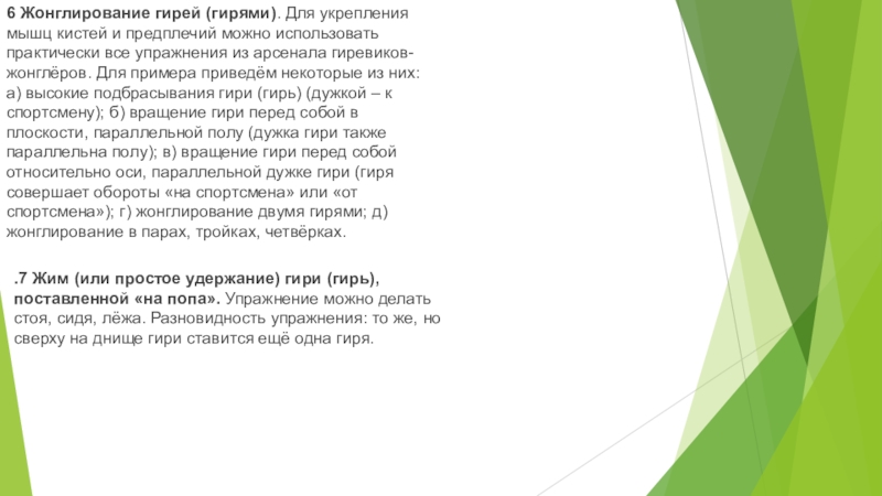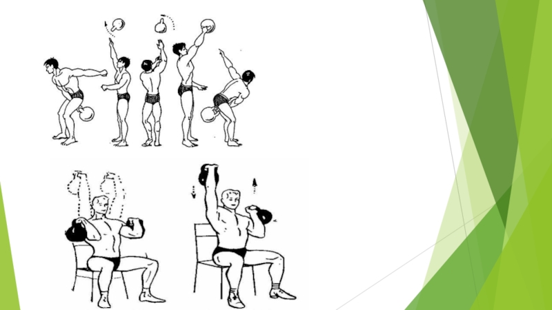 .7 Жим (или простое удержание) гири (гирь), поставленной «на попа». Упражнение можно делать стоя, сидя, лёжа. Разновидность упражнения: то же, но сверху на днище гири ставится ещё одна гиря.