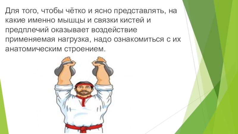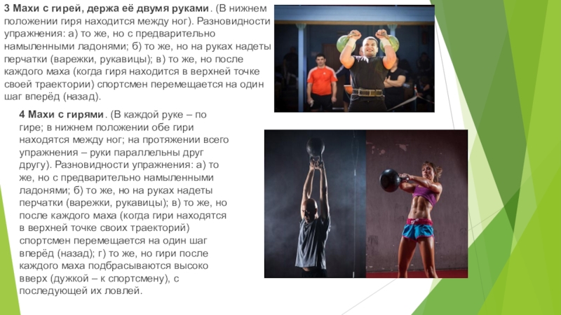 4 Махи с гирями. (В каждой руке – по гире; в нижнем положении обе гири находятся между ног; на протяжении всего упражнения – руки параллельны друг другу). Разновидности упражнения: а) то же, но с предварительно намыленными ладонями; б) то же, но на руках надеты перчатки (варежки, рукавицы); в) то же, но после каждого маха (когда гири находятся в верхней точке своих траекторий) спортсмен перемещается на один шаг вперёд (назад); г) то же, но гири после каждого маха подбрасываются высоко вверх (дужкой – к спортсмену), с последующей их ловлей.
