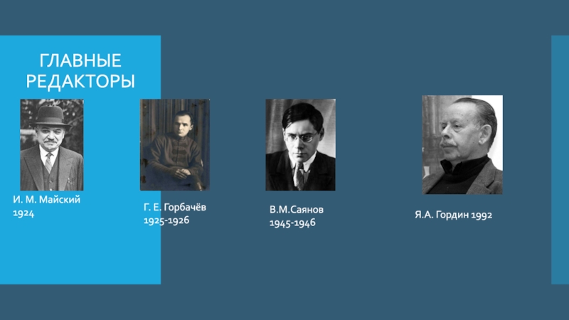 ГЛАВНЫЕ РЕДАКТОРЫ И. М. Майский 1924 Г. Е. Горбачёв 1925-1926В.М.Саянов 1945-1946Я.А. Гордин 1992